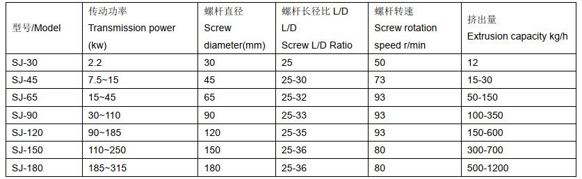 SJ 系列單螺桿擠出機特點:主要用于擠出軟-硬聚氯乙烯-聚乙烯等熱塑性塑料之用,它與相應的輔機(包括成型機頭)配合,可加工多種塑料制品,如膜-管-板-絲帶等,亦可用于造粒。塑料擠出機設計先進,質量高,塑化好,能耗低,采用漸開線齒輪傳動,具有噪音低,運轉平穩,承載力大,壽命長等特點。