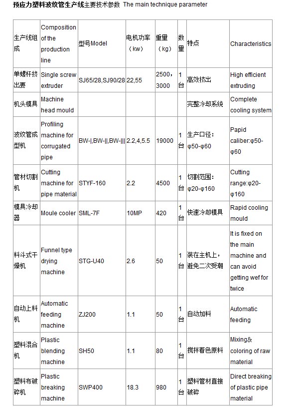預應力單波紋管作為一種新型成孔材料,與金屬波紋管相比,它具有不怕酸、堿腐蝕,密封性好,無滲水、漏漿,環剛度高,摩擦系數小,耐老化,抗電腐蝕,柔軟韌性好,不易被搗棒鑿破,施工連接方便等優點,解決了傳統金屬波紋管的所有弊端。該管材最初是從國外引進的,價格高,供貨時間長。針對次現狀,青島中塑料機械制造有限公司在積極消化吸收進口設備的基礎上,依靠科研院校,研制開發并生產了以HDPE預應力單壁波紋管為主的管材生產線。生產規格從φ50mm-φ160mm。該項目填補了國內空白,無疑會對預應力單壁波紋管管材的推廣及應用超到良好的推動作用,也會給制品生產商帶來豐厚的利潤。